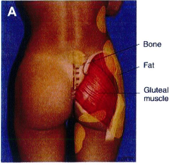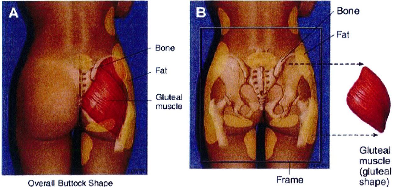 Sự tương tác của 4 tổ chức này mang lại cho vùng mông một hình dáng đặc trưng cụ thế (hình 1A). Để đơn giản hóa chủ đề phức tạp này, hãy tưởng tượng cơ thể là một cấu trúc có thể tháo rời. Khi tách cơ ra thì phần còn lại là khung xương, mỡ và da, có thể gọi chung là khung (Hình 1B).