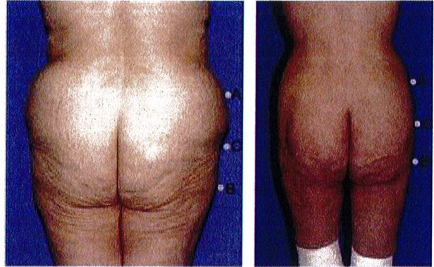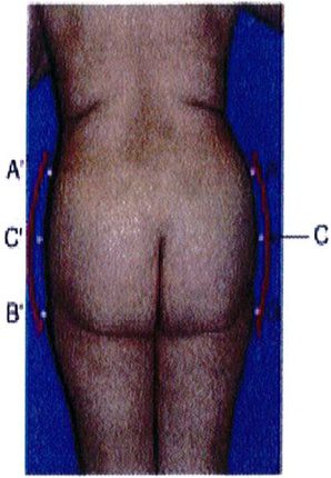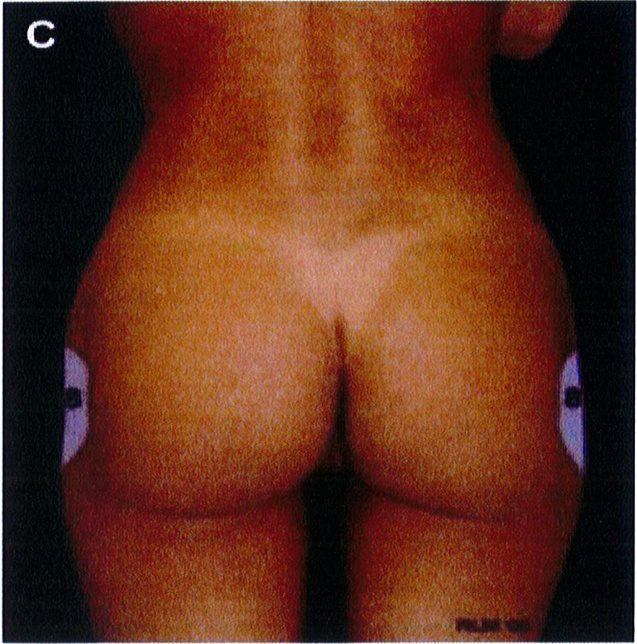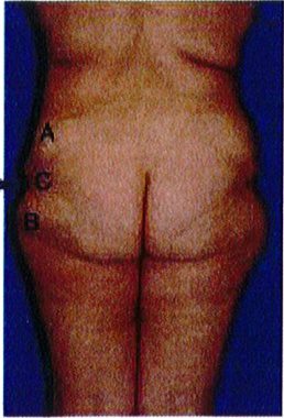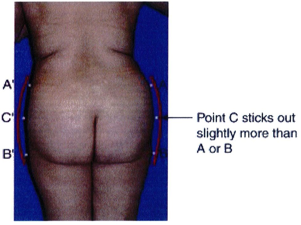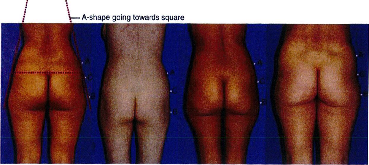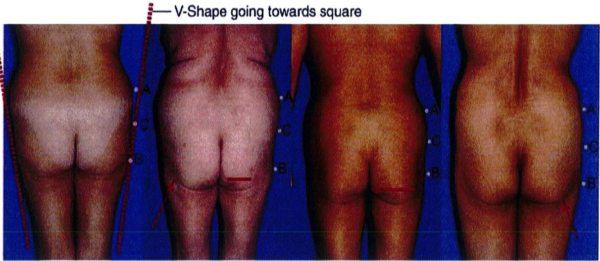 Dạng khung này thường được cải thiện khi hút mỡ ở điểm B hoặc vùng đùi bên (Hình 12). Điểm C có thể cần ghép mô mỡ, tùy thuộc vào mức độ lõm. Nên tránh hút mỡ quá nhiều ở điểm B để ngăn chặn điểm lõm ở khu vực này, ngẫu nhiên hình thành ranh giới giữa vùng mông và mặt ngoài đùi.