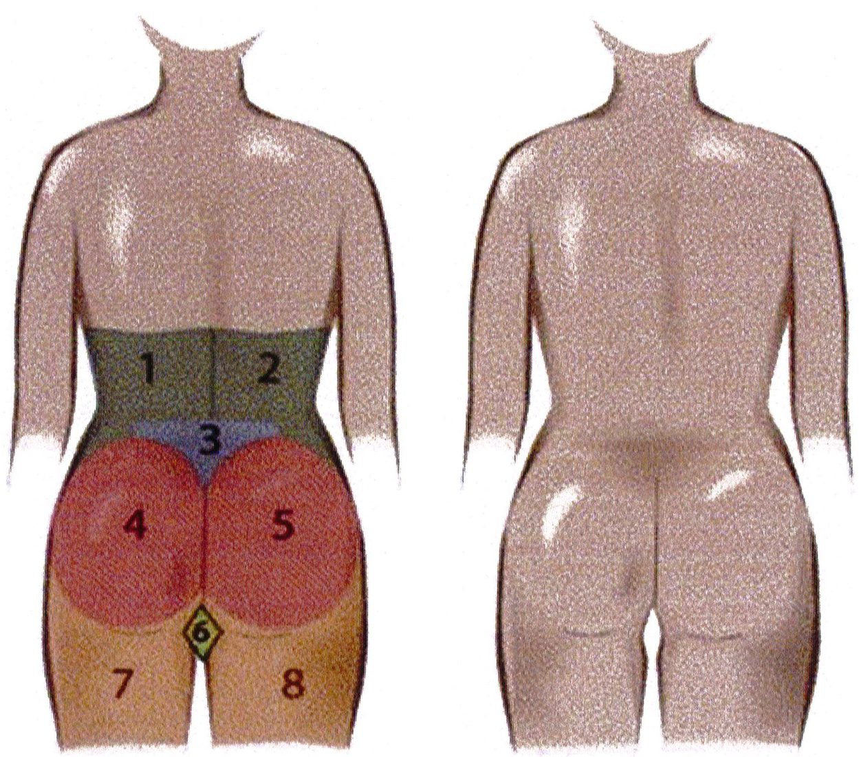 Aesthetic Unit/Zones:Đơn vị thẩm mỹ vùng mông. 1.Sacrum V-zone: Vùng cũng chữ V. 2.Flank: Hông. 3. Upper buttock : Mông trên, 4. Lower back: Thắt lưng. 5.Outer leg : Bờ ngoài đùi. 6. Gluteus: Mông.