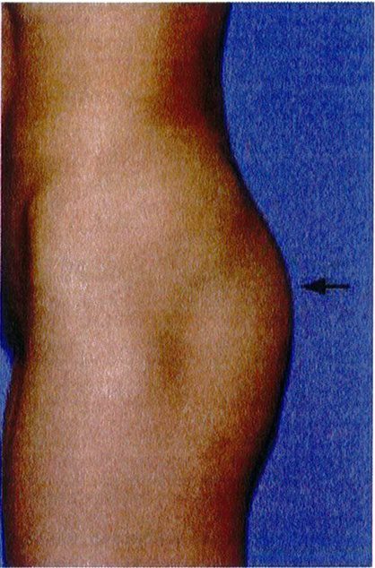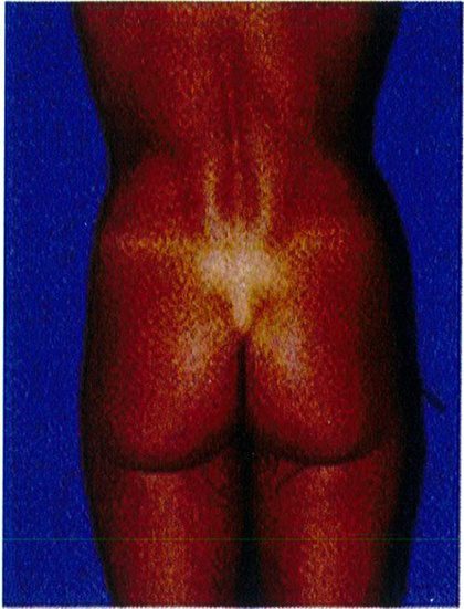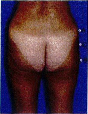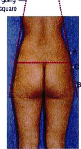 Vùng này lõm vào bao nhiêu sẽ ảnh hưởng tích cực đến tính thẩm mỹ bấy nhiêu. Nếu lý tưởng, bờ các khối cơ mông phải dễ dàng xác định được bằng cách sờ ở phía bên ngoài, với hình dạng bán nguyệt cong lên trên (Hình 21).