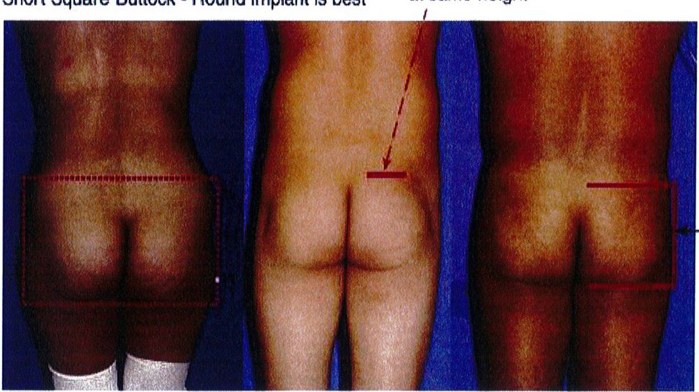 1. Xác định xem đây là bệnh nhân có cơ mông lớn cao, trung bình hay ngắn; điều này sẽ giúp ích trong việc lựa chọn vật implant. Nếu cơ cao (tỉ 2:1) thì dùng anatomic im- plant, nếu ngắn (tỉ 1:1) dùng vật cấy tròn (round). Hầu hết bệnh nhân sẽ nằm trong loại cơ trung gian, trong những trường hợp này, hãy chú ý nhìn bệnh nhân từ phía bên, xác định phần lớn thể tích mông nằm ở vùng trên, giữa hay dưới. Nếu phần lớn nằm ở phía trên thì dùng ana- tomic implant, nếu phần lớn nằm ở trung tâm thì dùng bất kỳ loại nào cũng được, còn nếu phần lớn nằm ở vùng mông dưới thì nên dùng