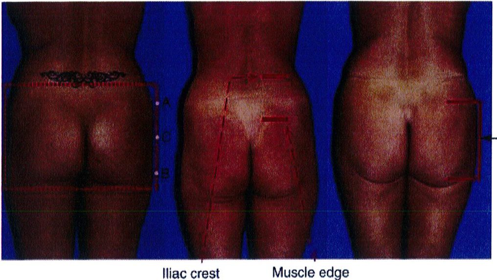 1. Phần tiếp giáp của vùng mông trên trong và tam giác cùng thường phải được xác định tính thẩm mỹ. Nếu vùng này có biểu hiện dẹt, đầy thì có thể có mỡ thừa ở vùng V (đường liên mông – xương cùng) hoặc thiếu thể tích mông (hoặc cả hai).