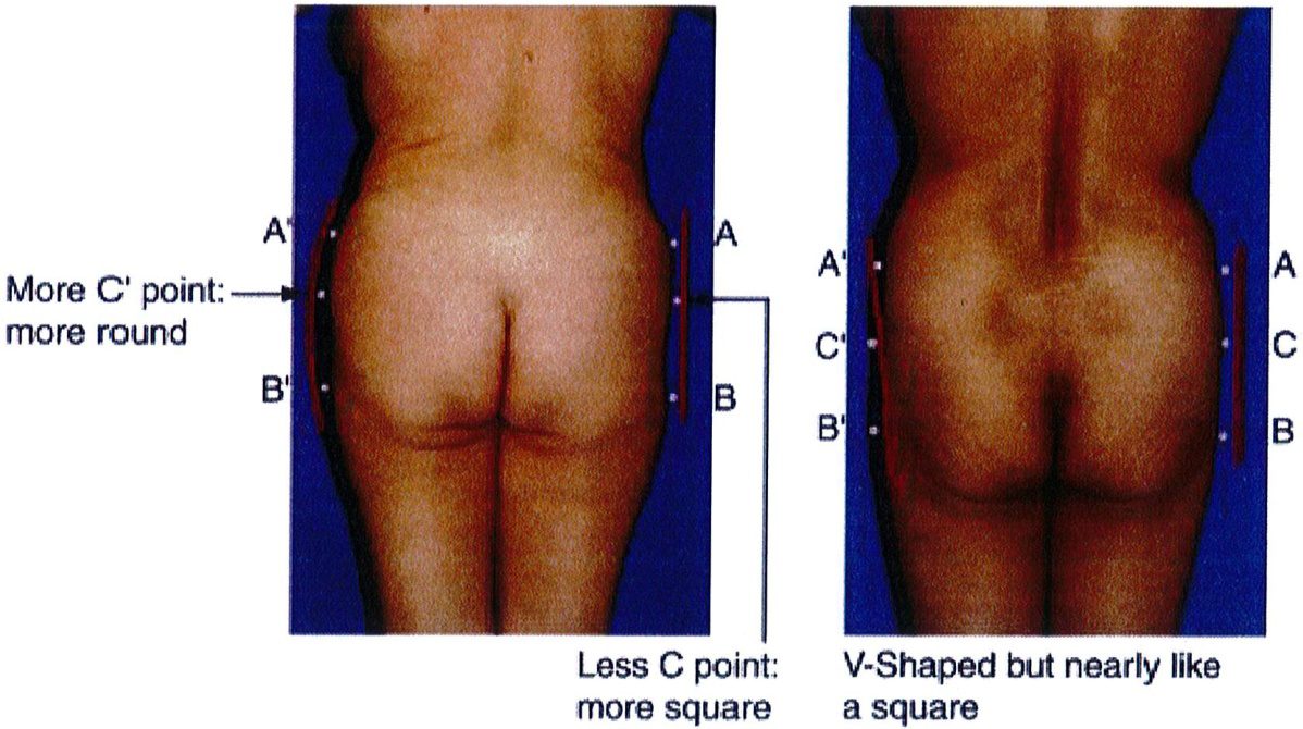 Điểm C có 2 chức năng: Đầu tiên là giúp phân biệt dạng mông tròn hay vuông. Mông tròn có lượng mỡ dư thừa ở điểm C này nhưng mông vuông thì có lượng mỡ bằng nhau hoặc lệch bên (Hình 5). Chức năng thứ hai và cũng là quan trọng nhất của điểm C là chúng giúp đánh giá mức độ lõm xuống ở điểm C trong mông vuông, mông hình chữ A hoặc hình chữ V. Mức độ lõm này được phân thành nhiều mức độ: 0, nhẹ, vừa, nặng (Hình 6).