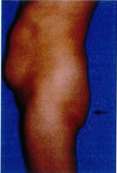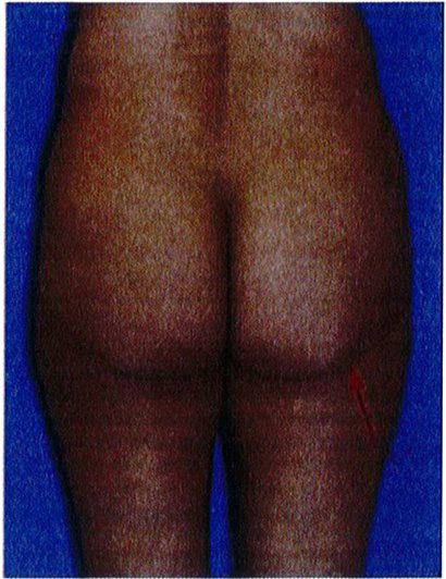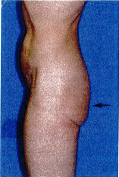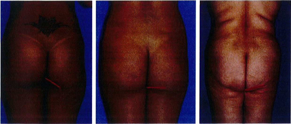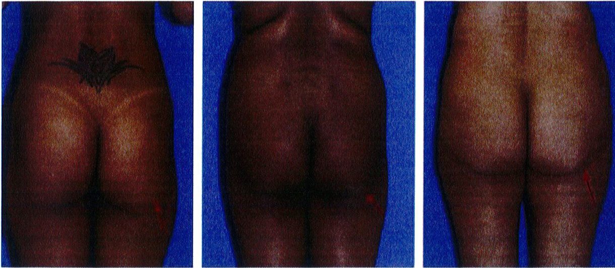 Hình. 13. Hình minh họa mông hình chữ V. Mũi tên màu đỏ cho biết đường ranh giới của mặt ngoài mông và mặt ngoài đùi: phương pháp trị liệu tốt nhất là cấy mô mỡ. Đường liền nét cho biết chiều rộng cơ mông lớn với bên trái là chiều rộng ngắn, bên phải là bình thường.
