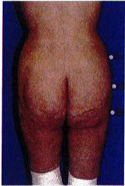 bên. Nếp lằn này mở rộng về phía mặt trong đùi, và góc tạo bởi chúng và đường liên mông thường lớn hơn 30°. Giai đoạn này cũng được mô tả bởi chỗ lõm ở phân dưới của khu vực trung tâm (hình 28). Các vết rạn da xuất hiện chủ yếu ở vùng điểm B, và da có độ đàn hồi kém với các vết rạn rải rác. Điều trị bệnh nhân ở giai đoạn này cần thực hiện nâng mông trên, cắt vùng da thừa dưới nếp lằn mông và làm đầy mông. Trong các thủ thuật này, có thể thực hiện 1 trong 3 trước đều được.