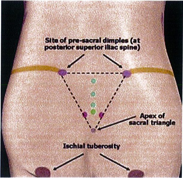 Hình 1. Các mốc giải phẫu quan trọng: mào chậu, gai chậu sau trên, xương cùng, xương cụt và ụ ngồi.
