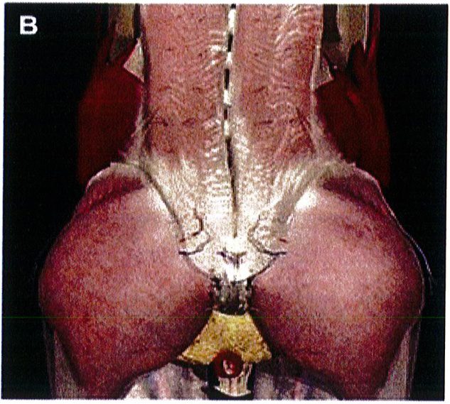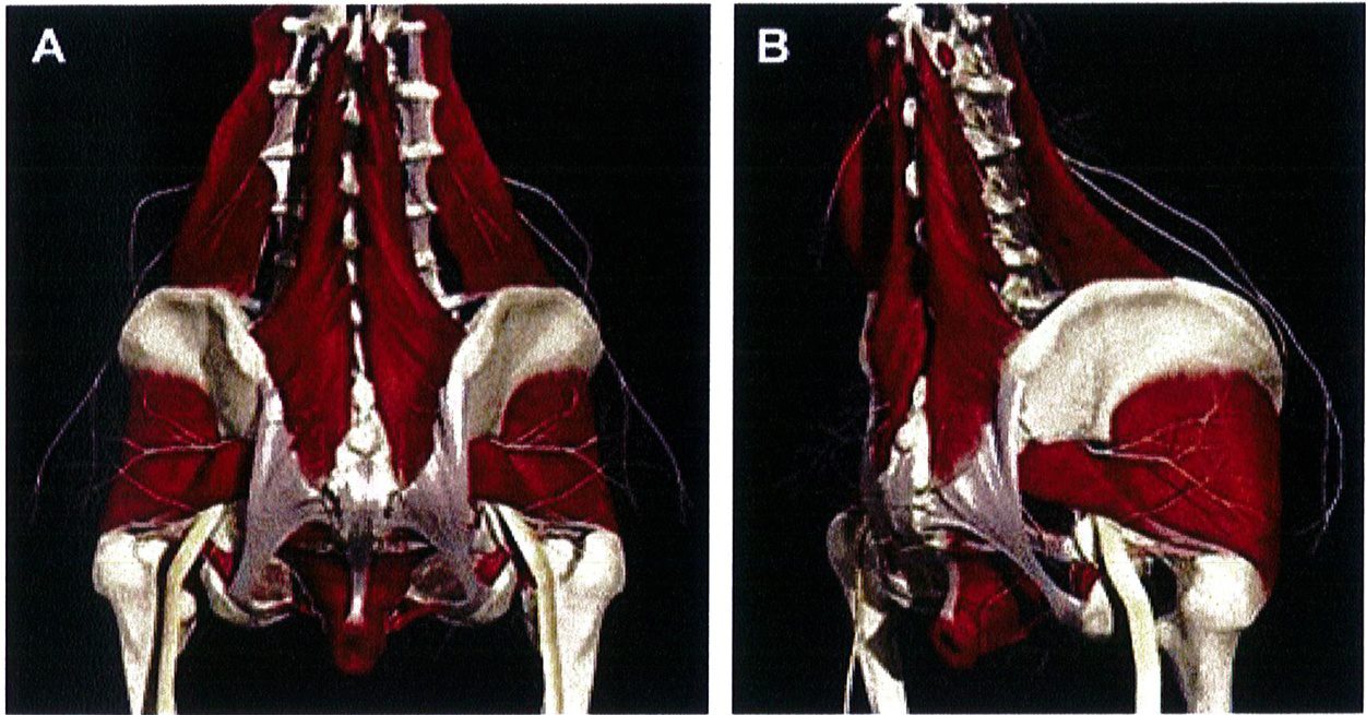 Hình 7. Giải phẫu hệ thống vùng mông và các lớp cân. (A) Hình ảnh hệ thống các lớp cân sau khi đã loại bỏ các cấu trúc giải phẫu khác và (B) các lớp cân vùng mông cũng như thắt lưng chậu.