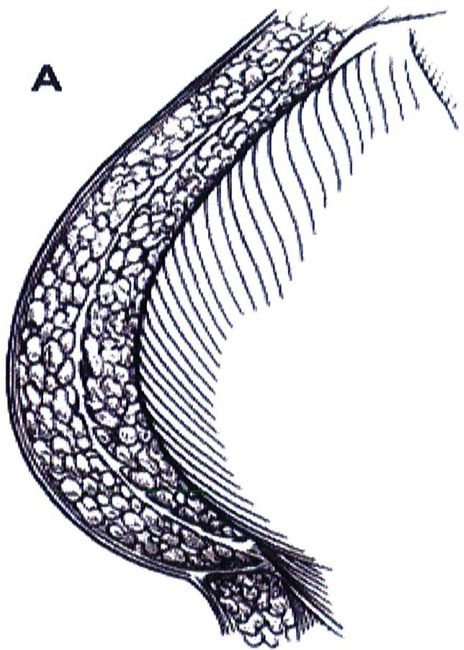 Những cấu trúc này tạo ra nếp gấp sâu, cố định ở phía dưới của mông. Chiều dài và mức độ hiện hữu của nếp gấp này đóng vai