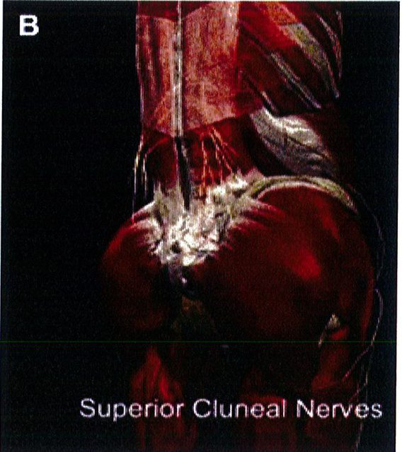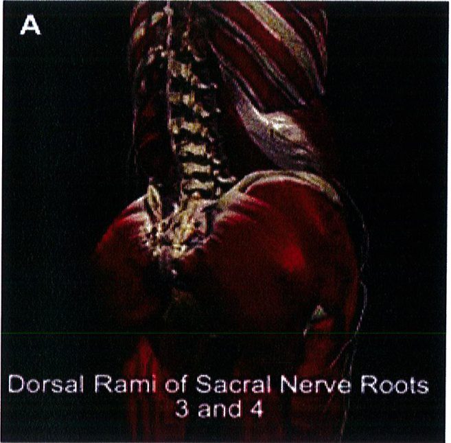 Hình 9. Thần kinh bì sau. (A) nhánh gian ngành sau L3 và L4 và (B) thần kinh mông trên.