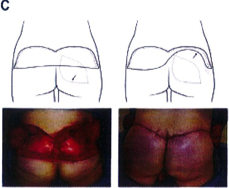 không nghiêm trọng cao hơn mức trung bình, với các thủ tục nâng mông bằng chất dẻo trong đó việc nhuẫn khuẩn sẽ là thảm họa. Các vạt khử biểu mô đã được sử dụng để tạo hình bờ mông trong một số trường hợp. Các tài liệu tham khảo đã được công bố về việc sử dụng mô tự thân trong việc ngăn ngừa những bất thường ở mông với CBL, nhưng thiếu chi tiết đáng kể và không chứng minh được khả năng làm đầy mông của chúng. Mô tả của động mạch mông trên, động mạch mông dưới, và các vạt sau lưng ngang và nguồn cung cấp mạch máu của chúng cũng củng cố khả năng tồn tại trên lâm sàng của phương pháp này. Các nghiên cứu giải phẫu gần đây hơn đã hoàn thiện thêm kiến thức của chúng ta về giải phẫu mạch máu của vùng cơ mông.