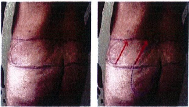 dụng nap chuyen Vị noạc nap ria mép, các mô của thanh tay cầm phía bên có chiều rộng và chiều dài mong muốn sau đó sẽ được rút ra. Một chiếc khăn hoặc thước dây được sử dụng để xác định độ quay không đủ của cánh xoay hoặc chuyển vị từ trước của các thanh tay cầm của nắp chuyển vị ria mép. Điểm giới hạn đối với vòng cung quay là 12 cm tính từ đường giữa đối với vạt di chuyển ria mép và đường viền dưới của cơ mông tối đa đối với vạt xoay. Khi đã ở vị trí nằm sấp, các vạch trên và dưới trung tâm (xương cùng) cho phần sau của CBL / EBL sau đó có thể được điều chỉnh thấp hơn 1 đến 3 cm để thích ứng với sự dịch chuyển cao hơn của các mô lỏng lẻo, Hếl đảm bảo an toàn cắt bỏ trung tâm, để bảo tồn trước tính thẩm mỹ của cơ mông, và để rút ngắn rãnh liên mông dài. Các mô tả truyền thống về đánh dấu CBL / EBL phía sau dẫn đến một vết rạch cuối cùng hoặc quá cao về mặt thẩm mỹ, vi phạm các đơn vị thẩm mỹ của cơ mông hoặc làm cho mông có hình dạng thon dài hoặc hình vuông.