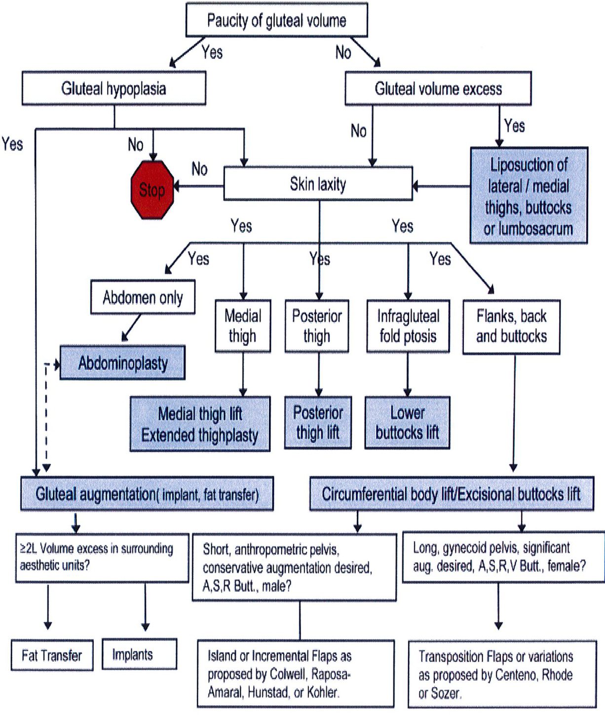 hơn bằng một vạt chuyển vị. Các vạt chuyển vị sẽ lấy thêm mô để lấp đầy một phần ba dưới của mông và phần bên dưới của mông hình chũ V; điểm hình chiếu cực đại càng thấp càng tiến gần tới vị trí ngang gò mu. Cuối cùng, chất lượng và độ lỏng lẻo của da bụng, hai bên sườn, hông, lưng, mông, đùi trước, đùi bên và đùi sau được ghi nhận Kết quả của những phân tích này sau đó được sử dụng để hướng dẫn thông qua một thuật toán tạo đường nét cơ mông để tạo đường nét cơ thể (Hình. 11). Khi đã đưa ra quyết định nâng mông và chỉ định một thủ thuật ngoại khoa để cải thiện sự lỏng lẻo của da mông phía sau, thì CBL hoặc EBL sẽ được xem xét. Nếu CBL hoặc EBL được chỉ định, thì phẫu thuật nâng mông bằng vạt cơ mông có cuống mạch nuôi trở thành thủ thuật được lựa chọn ở những bệnh nhân có BMI dưới 30 kg / m2. Sơ đồ dưới đây chỉ ra các lựa chọn ưu tiên cho nâng mông trong các điều kiện khác nhau. Theo thời gian, việc sử dụng các mô tự thân làm vạt hoặc chuyển mỡ đã trở thành những thủ tục được lựa chọn của hầu hết các Bác sĩ phẫu thuật. Nếu có sự thiếu hụt đáng kể ở phía bên như ở mông hình chữ V, có thể kết hợp chuyển mỡ tự thân với vạt ria mép để tinh chỉnh thêm. Vạt ria mép và các vạt chuyển vị khác đã được thực hiện các biện pháp điều trị bổ sung như thêm chất độn hoặc chuyển mỡ theo giai đoạn hoặc implant (ít cần thiết hơn do đã đạt được sự
