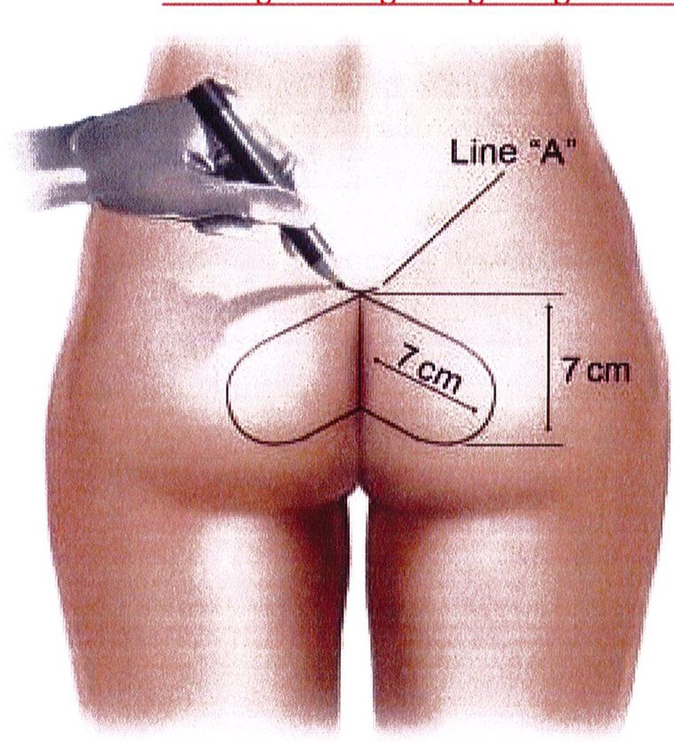 Hình. 1. Hình trái tim ngược được đánh dấu, với đường A đi từ giới hạn trên của chúng dọc xuống khoảng 7-8cm. Từ cách đánh dấu này sẽ hướng dẫn Bác sĩ phẫu thuật bóc tách lớp cơ mông lớn. Trục chính của mỗi bên dài 7cm và hướng theo chiều đi của khối cơ mông lớn, ở một góc xấp xỉ 45 độ so với đường liên mông. Hình thoi đánh dấu trên đường liên mông cũng dài 7cm.