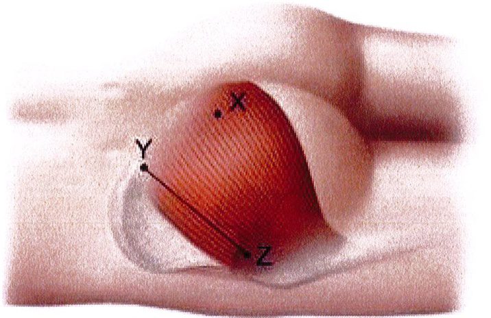 Các điểm X, Y, Z liên quan với khối cơ mông lớn, trong mặt phẳng sandwich. Bằng cách nối hai điểm (X, Y) bằng bộ bóc tách, từ đó kéo dài đường thẳng này tới điểm Z để hình thành mặt phẳng sandwich.