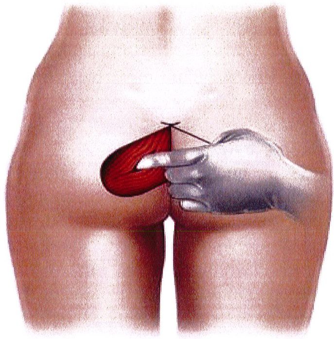 Dải da hình trái tim ngược ban đầu được cắt ra, Bác sĩ sẽ lọc phần ngoại bì bỏ đi, để lại trung và hạ bì. Sau đó đặt lại vị trí cũ, khâu nối phần hạ bì hai bên với dây chẳng cùng cụt để tạo hình lại rãnh liên mông. Lúc này mối khâu cân cơ vừa nãy sẽ được khâu tiếp với lớp hạ bì này trước khi đóng da.