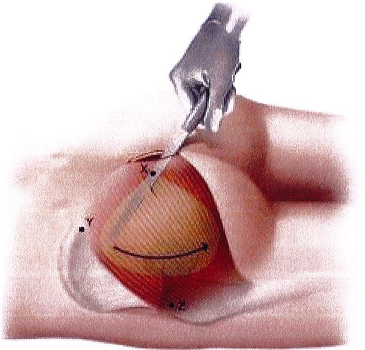 Hình. 5. Bằng cách đặt dụng cụ bóc tách như hình, với điểm tựa là khối xương cùng, chúng ta có thể dễ dàng xoay chúng từ đoạn XY theo chiều hướng xuống dưới tới vị trí điểm Z. Kết quả đạt được là một khoang hình tam giác (hoặc ¼ hình tròn) bảo tồn được các sợi cơ. Trong quá trình này, nếu phát hiện còn vách cơ nào có thể dùng ngón tay trỏ để bóc tách nốt phần còn lại. Tiếp đó, các dụng cụ banh được đặt vào trong để duy trì và mở rộng khoang sandwich cho tới khi phù hơp với kích thước mô ghép.