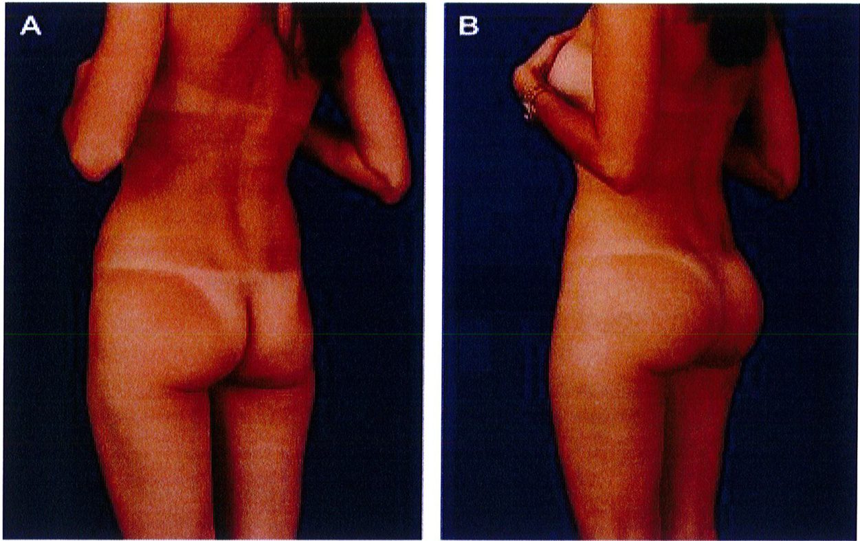 Hình. 6. (A) Bệnh nhân nữ 44 tuổi yêu cầu ghép mỡ để cải thiện hình thể mông, nhưng cô đã được thuyết phục chuyển sang implant mông. Thủ thuật bao gồm implant khối hình oval thể tích 350 cc và hút mỡ ở hông, eo dưới để tiêm vào vùng thiếu hụt ở mấu chuyển lớn. (B) Sau 6 tháng phẫu thuật.