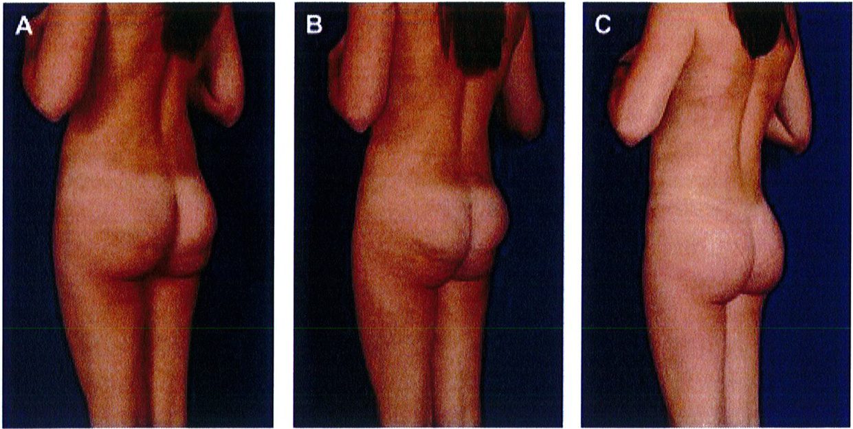 Hình. 7. (A) Bệnh nhân nữ 36 tuổi phàn nàn về tình trạng lộ mô cấy dưới da ở cưc trên của mông. Trên hình CT, các mô cấy nằm bên trong cơ lớp cơ mỏng và phần cơ còn lại bị dồn xuống dưới, tạo ra hiệu ứng bong bóng kép. (B) Khi co cơ, có thể thấy rõ khối implant lộ dưới da. Chỉ có phần dưới của cơ co lại do khối implant đã chiếm chỗ hết ở cực trên. (C) Các mô cấy cũ được lấy ra, mặt phẳng được đóng kín bởi chỉ Vicryl 2-0 và tạo lại mặt phẳng mới, đặt túi mới. một dẫn lưu được đặt cạnh túi implant mới để tránh biến chứng bướu huyết thanh. Đây là một biến chứng thường gặp khi loại bỏ và thay thế các mô cấy. Sau 4 tháng, các mô cấy được thay thế bằng phương pháp XYZ. Hình (C) là kết quả thu được sau 6 tháng cấy ghép lại.