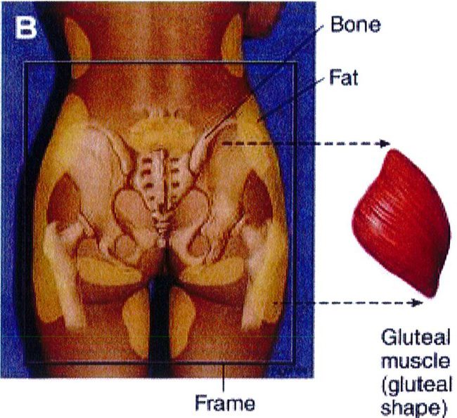Sự tương tác của 4 tổ chức này mang lại cho vùng mông một hình dáng đặc trưng cụ thế (hình 1A). Để đơn giản hóa chủ đề phức tạp này, hãy tưởng tượng cơ thể là một cấu trúc có thể tháo rời. Khi tách cơ ra thì phần còn lại là khung xương, mỡ và da, có thể gọi chung là khung (Hình 1B).
