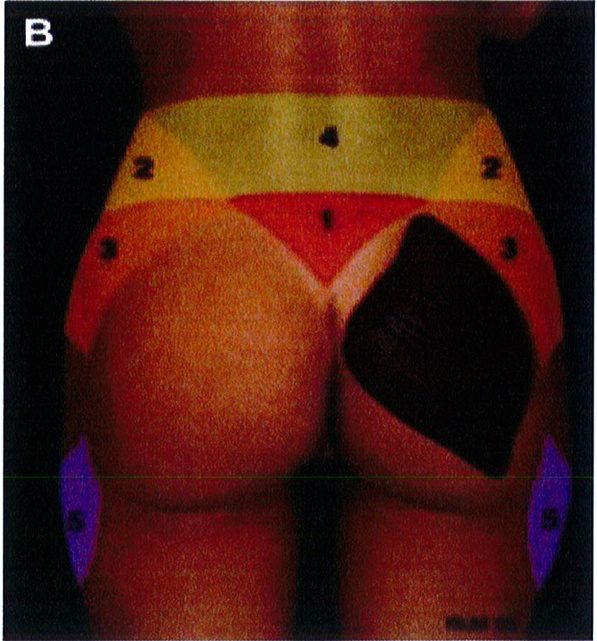 Aesthetic Unit/Zones:Đơn vị thẩm mỹ vùng mông. 1.Sacrum V-zone: Vùng cũng chữ V. 2.Flank: Hông. 3. Upper buttock : Mông trên, 4. Lower back: Thắt lưng. 5.Outer leg : Bờ ngoài đùi. 6. Gluteus: Mông.
