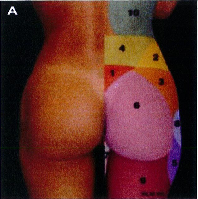 7.Diamond zone:inner gluteal/leg injection: Vùng hình thoi: Vùng đùi trong/vùng hút mỡ. 8.Mid-lateral buttock point:Điểm C. 9.Inferior gluteal /posterior leg junc- tion: Mặt sau đùi/mặt dưới mông. 10.Upper back: Lưng.