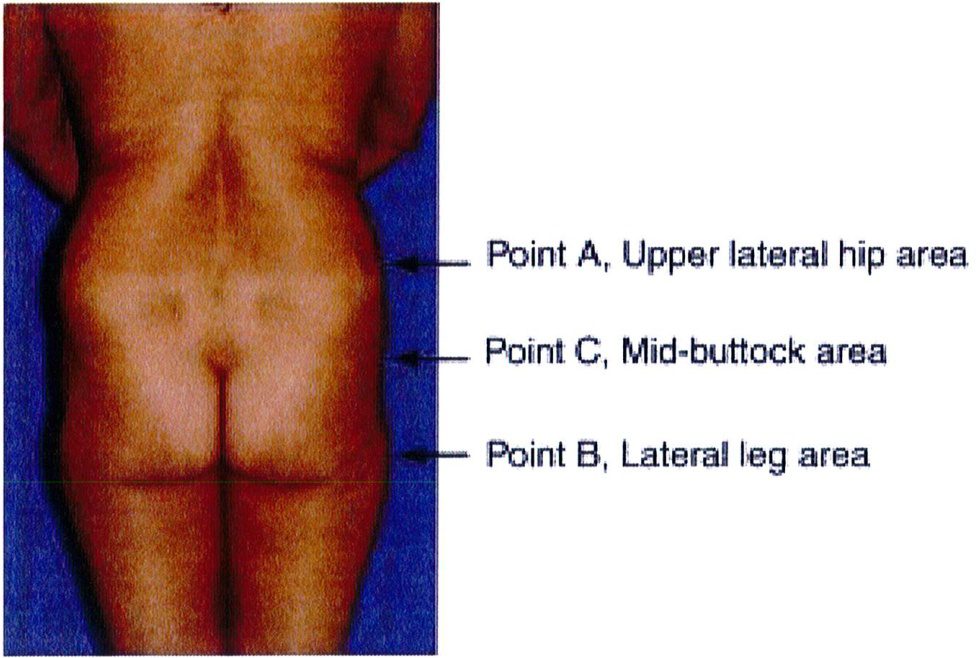 8.Mid-lateral buttock point:Điểm C. 9.Inferior gluteal /posterior leg junc- tion: Mặt sau đùi/mặt dưới mông. 10. Upper back: Lưng.