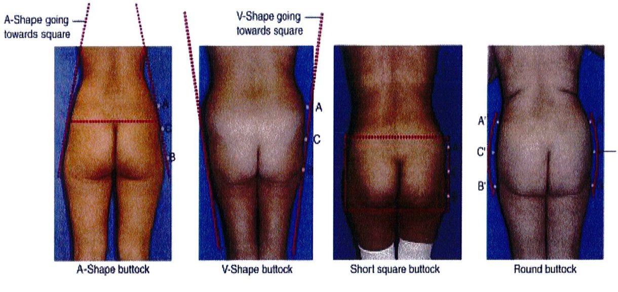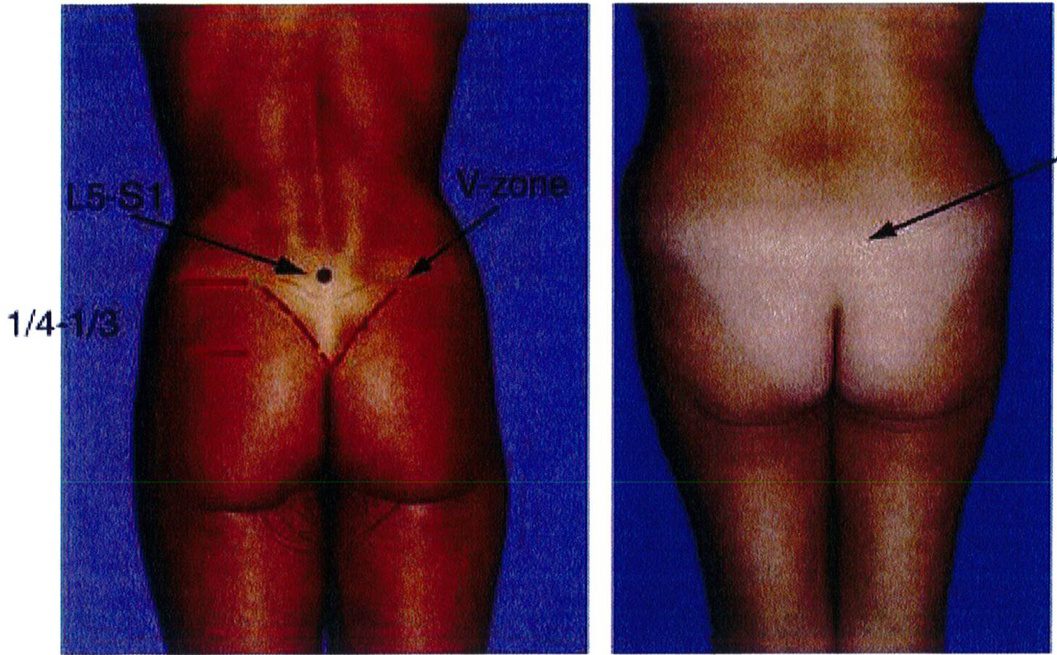 1. Phần tiếp giáp của vùng mông trên trong và tam giác cùng thường phải được xác định tính thẩm mỹ. Nếu vùng này có biểu hiện dẹt, đầy thì có thể có mỡ thừa ở vùng V (đường liên mông – xương cùng) hoặc thiếu thể tích mông (hoặc cả hai).