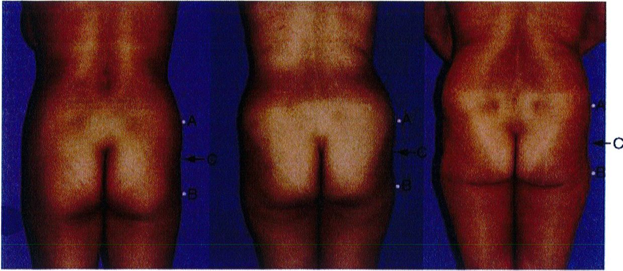 Điểm C có 2 chức năng: Đầu tiên là giúp phân biệt dạng mông tròn hay vuông. Mông tròn có lượng mỡ dư thừa ở điểm C này nhưng mông vuông thì có lượng mỡ bằng nhau hoặc lệch bên (Hình 5). Chức năng thứ hai và cũng là quan trọng nhất của điểm C là chúng giúp đánh giá mức độ lõm xuống ở điểm C trong mông vuông, mông hình chữ A hoặc hình chữ V. Mức độ lõm này được phân thành nhiều mức độ: 0, nhẹ, vừa, nặng (Hình 6).