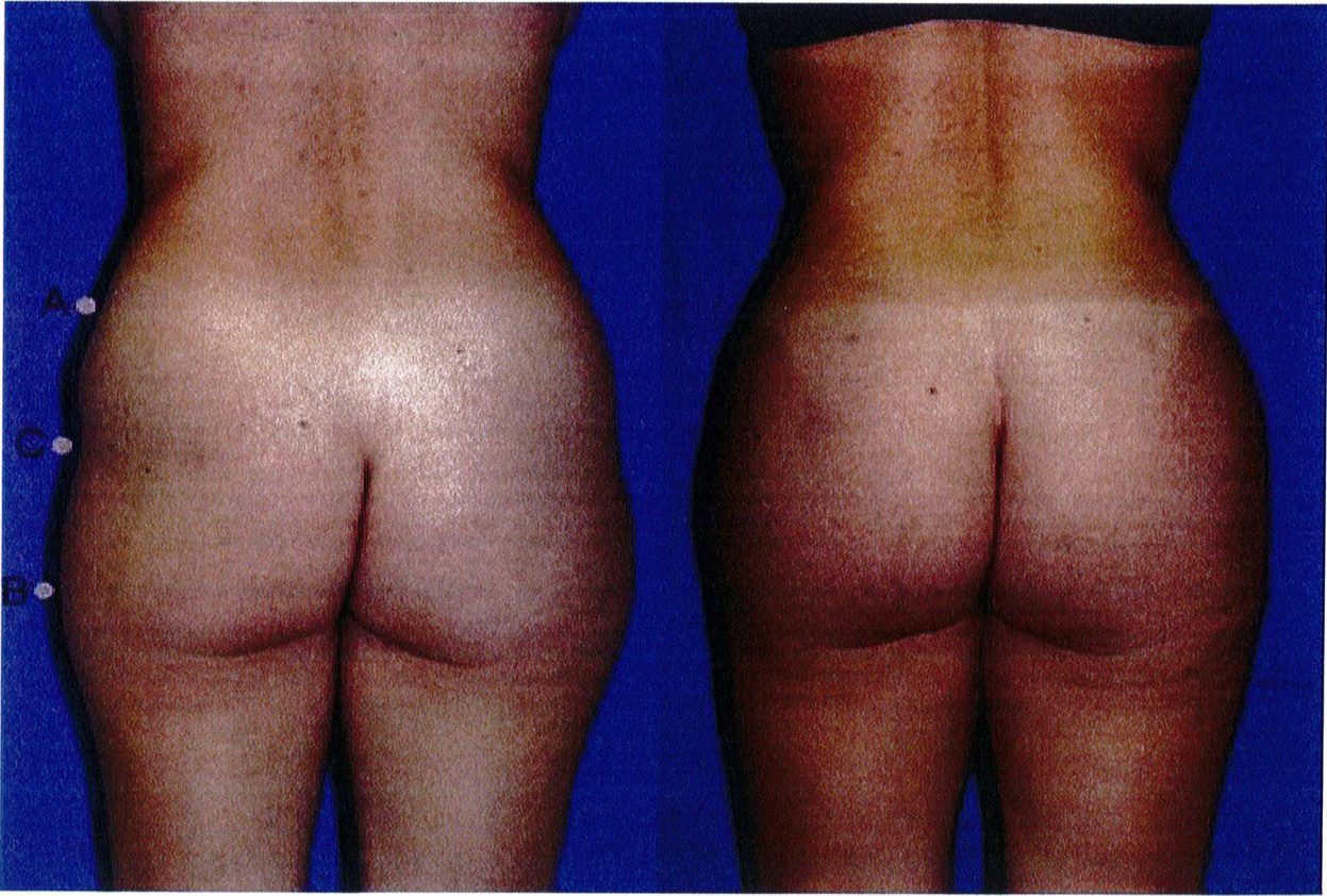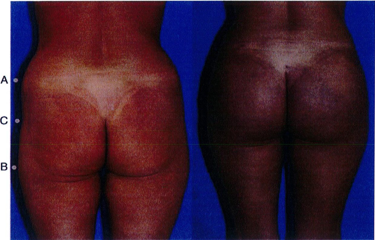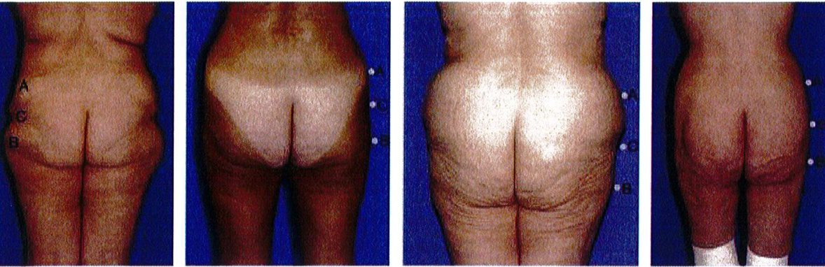 Dạng khung này thường được cải thiện khi hút mỡ ở điểm B hoặc vùng đùi bên (Hình 12). Điểm C có thể cần ghép mô mỡ, tùy thuộc vào mức độ lõm. Nên tránh hút mỡ quá nhiều ở điểm B để ngăn chặn điểm lõm ở khu vực này, ngẫu nhiên hình thành ranh giới giữa vùng mông và mặt ngoài đùi.