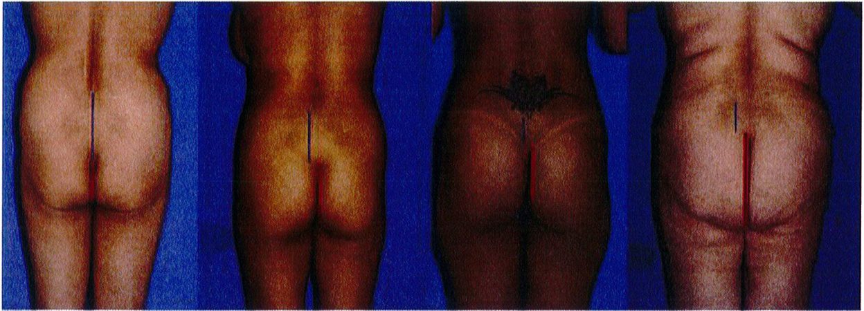 Để xác định chiều rộng của khối cơ, vẽ 1 đường thẳng ở giữa mông (song song với đường liên mông). Sau đó xác định chiều rộng của nền khối cơ mông lớn từ đường giữa của cơ thể. Nếu đường đo nền khối cơ này (như hình 13, ảnh thứ 2 từ trái sang) không vượt quá đường thẳng vừa vẽ, chúng ta