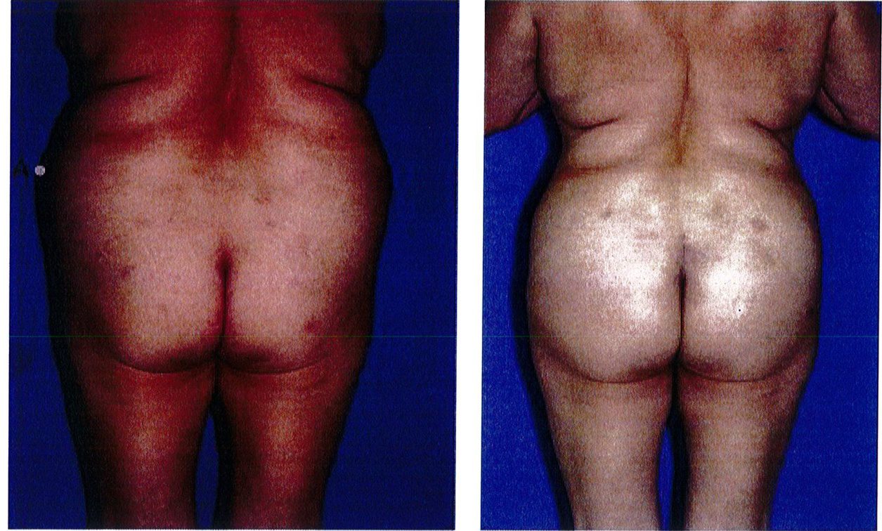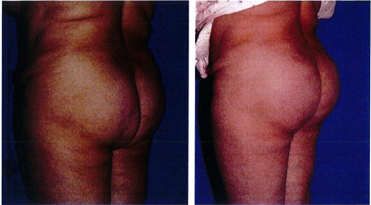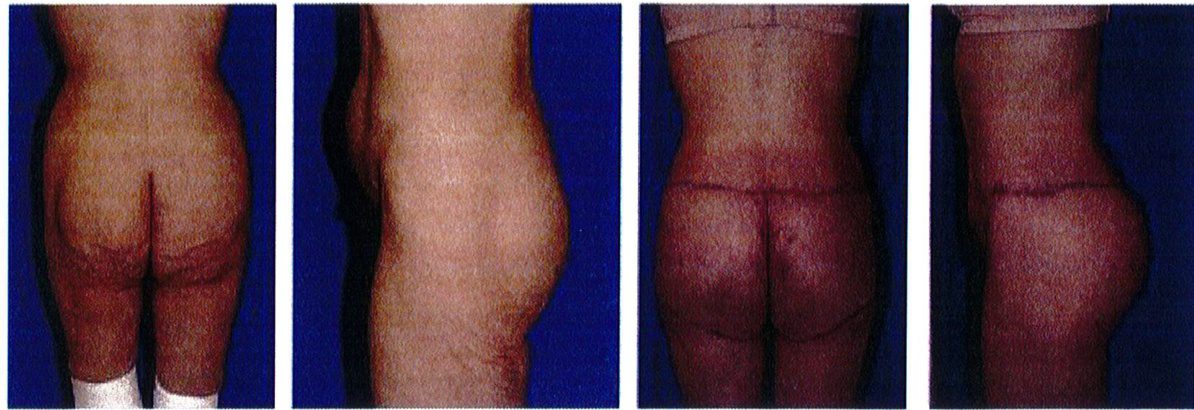Hình. 23. Hình ảnh trước (trái) và sau (phải) của một bệnh nhân đã thực hiện nâng mông bằng thủ thuật cấy vòng lớn, nếp lắn mông cũ bỏ, kèm theo hút mỡ vùng mông trên và vùng dưới nếp lằn mông.