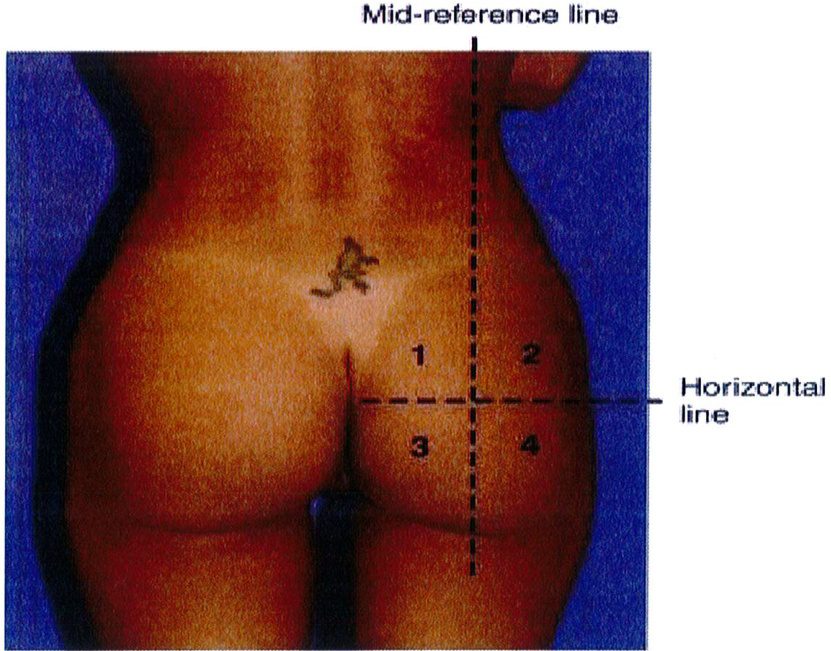 Hãy tưởng tượng cơ mông nằm trên khung chậu với trục đối xứng là đường liên mông. Theo lý thuyết, cơ mông có khối lượng bằng nhau ở hai bên và có hình dạng của 1 quả bóng đá. Để đánh giá kỹ hơn, vẽ một đường nằm ngang (Hình 18). Điều này cho phép chia mông thành 4 góc phần tư: trên trong, trên ngoài, dưới trong và dưới ngoài. Vòng mông lý tưởng là vòng mông phân bố đểu tổ chức ở 4 vùng trên. Khi đánh giá từ góc nhìn sau trước, mỗi góc trong số 4 góc này phải được đánh giá xem chúng bằng nhau hay thiếu so với các góc còn lại như thế nào.