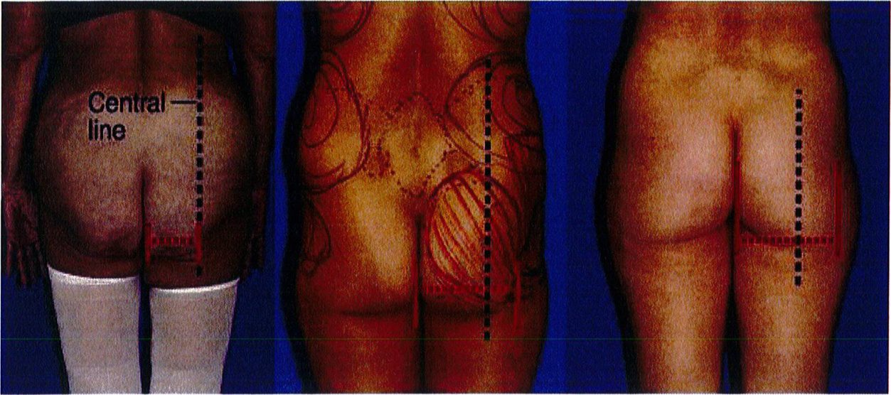 sẽ kêt luận đây là cơ mông có chiêu rộng hẹp. Nếu nó đi qua đường giữa mông này khoảng 10-30% thì được quy về chiều rộng bình thường. Và nếu vượt trên khoảng 40-50% thì được gọi là rộng. Mông đạt tiêu chuẩn thẩm mỹ ở người trẻ thuộc nhóm chiều rộng bình thường, và nếp lăn mông bên dưới chạy đến đường giữa hoặc chỉ vượt qua đường giữa mông đó 1 đoạn ngắn (Hình 1A).