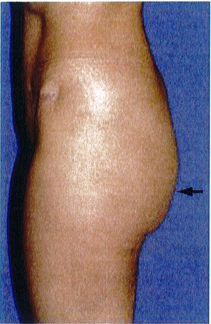 bên. Nếp lằn này mở rộng về phía mặt trong đùi, và góc tạo bởi chúng và đường liên mông thường lớn hơn 30°. Giai đoạn này cũng được mô tả bởi chỗ lõm ở phân dưới của khu vực trung tâm (hình 28). Các vết rạn da xuất hiện chủ yếu ở vùng điểm B, và da có độ đàn hồi kém với các vết rạn rải rác. Điều trị bệnh nhân ở giai đoạn này cần thực hiện nâng mông trên, cắt vùng da thừa dưới nếp lằn mông và làm đầy mông. Trong các thủ thuật này, có thể thực hiện 1 trong 3 trước đều được.