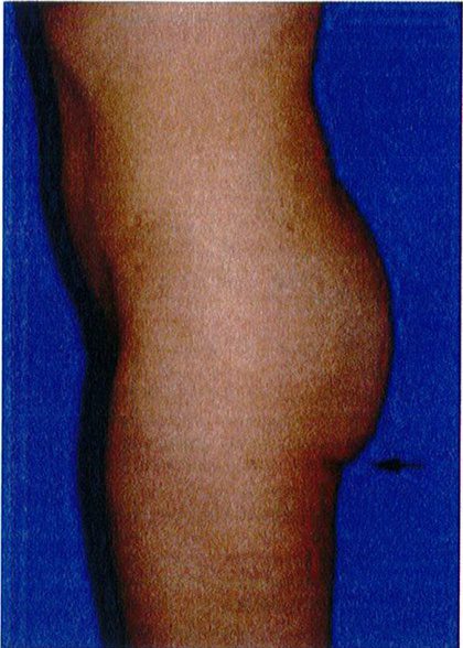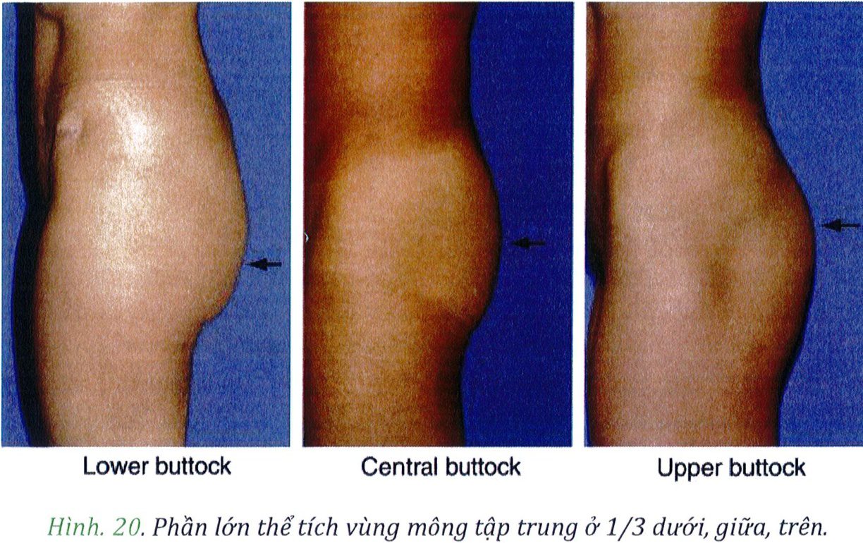 Vùng này lõm vào bao nhiêu sẽ ảnh hưởng tích cực đến tính thẩm mỹ bấy nhiêu. Nếu lý tưởng, bờ các khối cơ mông phải dễ dàng xác định được bằng cách sờ ở phía bên ngoài, với hình dạng bán nguyệt cong lên trên (Hình 21).