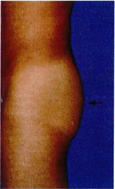 Hình. 13. Hình minh họa mông hình chữ V. Mũi tên màu đỏ cho biết đường ranh giới của mặt ngoài mông và mặt ngoài đùi: phương pháp trị liệu tốt nhất là cấy mô mỡ. Đường liền nét cho biết chiều rộng cơ mông lớn với bên trái là chiều rộng ngắn, bên phải là bình thường.