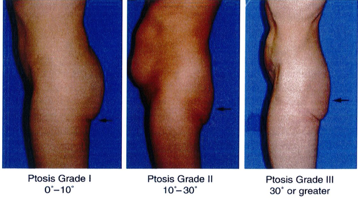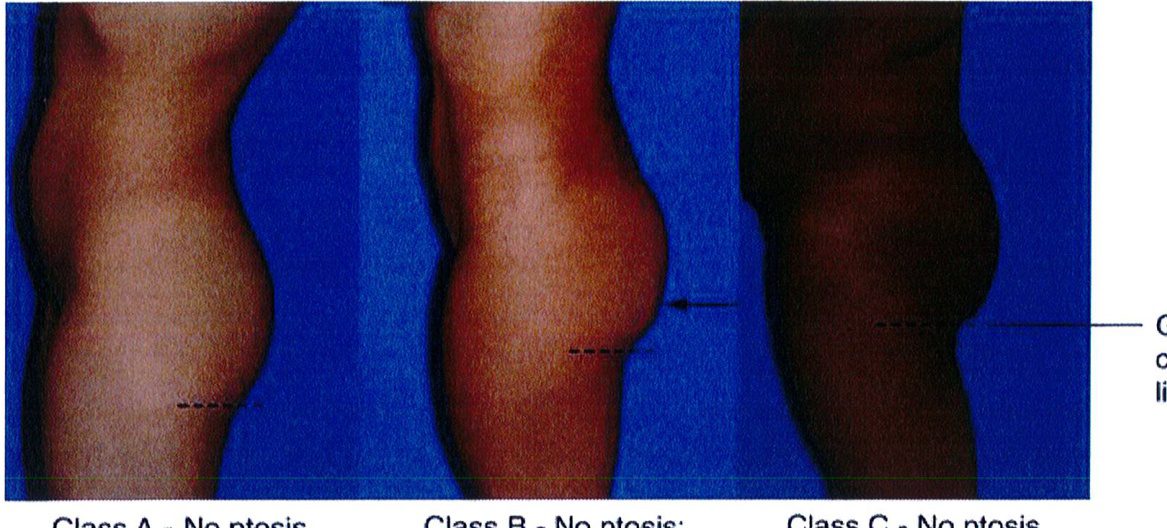 Class A- No ptosis: Lớp A – Không sa Class B – No ptosis: depression, lower part of central zone: Lớp B – Không sa: Lõm ở phía dưới vùng trung tâm. Class C – No ptosis at crease: Lớp C – Không sa xuống dưới nếp lằn mông. Gluteal crease line : Nếp lắn mông