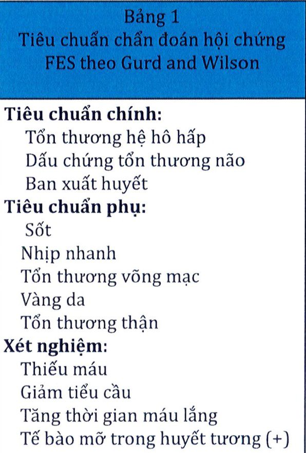 phái việc tiêm chất beo như trong cơ chế của huyết tắc mỡ. Bệnh nhân FES đã được phát hiện có các giọt chất béo trong dịch rửa phế quản, nước tiểu và huyết thanh. Việc chẩn đoán thường dựa trên một loạt các triệu chứng, tuy nhiện điều trị chỉ mang tính hỗ trợ chứu không giải quyết được căn nguyên. Gurd đã mô tả các tiêu chuẩn chính và phụ để chẩn đoán hội chứng này. Bảng 1 liệt kê đầy đủ bộ tiêu chuẩn này. Thông thường, các triệu chứng thần kinh xuất hiện đầu tiên, với biểu hiện rối loạn tri giác, từ lơ mơ tới hôn mê. Tiếp theo là các triệu chứng hô hấp với biểu hiện từ khó thở nhẹ cho tới ARDS. Khoảng 50% số bệnh nhân xuất hiện các ban xuất huyết. Dấu hiệu thường gặp nhất là nhịp nhanh (tương tự thuyên tắc phổi) nhưng chúng lại không đặc hiệu cho FES. Wang và cộng sự đã xuất bản một bài báo đánh giá về tất cả các triệu chứng cũng như các dấu hiệu, xét nghiệm liên quan đến FES.