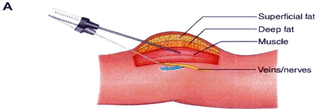 Hình. 4. (A) Các vị trí đặt kim với góc tới và độ sâu không chính xác, đi qua giới hạn là các tổ chức xơ sợi ngăn cách tổ chức dưới da và cơ, cơ và mạch máu thân kinh dưới cơ. Khuyến cáo không đưa kim đi quá các lớp cân này (đưa kim qua sẽ có cảm giác tay) và nên thay đổi góc tiêm liên tục để tránh phạm vào các tổ chức mạch máu cũng như thần kinh. (B) Bệnh nhân nằm sấp với một cái gối đệm phía dưới giúp quá trình ghép mỡ được thuận lợi và dễ dàng hơn, hạn chế các thương tổn mạch máu thần kinh. (C) Các tổ chức mô liên kết phải được giải phóng trước khi đưa canuyn vào để tránh việc đầu canuyn bị xoắn vặn và bị đẩy vào lớp sâu hơn chứa tổ chức mach máu thần kinh quan trong.