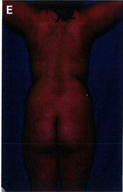 Hình. 5. (A) (Left) Hình ảnh trước khi hút mỡ và chuyển mỡ: (B) (Phải) Sau khi chuyển mỡ vào hai bên mông và hút mỡ ở cánh tay, lưng, bụng và đùi trong. (C,D) Chú ý sự khác biệt giữa hình bên trái và bên phải, đặc biệt là tình trạng bất đối hai bên xương chậu. (E ) Khoảng cách và góc thay đổi giữa xương chậu và khung chậu giữa bên phải và bên trái. (F) Bên phải có khoảng cách chậu-sườn ngắn hơn.
