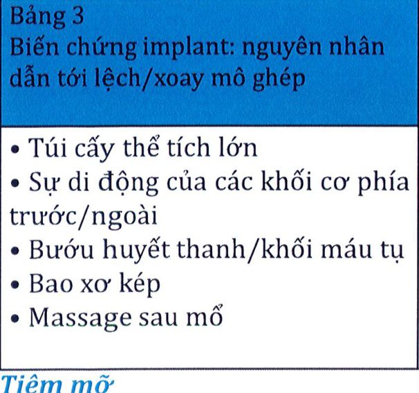 tại chỗ. Để tránh hiện tượn xoay/ dịch chuyển và đảm bảo sự ổn định của mô cấy, điều quan trọng là phải đánh giá chính xác kích thước mô cấy, giúp tạo ra một khu vực đặt túi cấy phù hợp giữa khối cơ mông lớn (Bảng 3). Nếu bóc tách quá nhiều sẽ dễ dẫn tới xoay, di lệch mô ghép (Bảng 4).