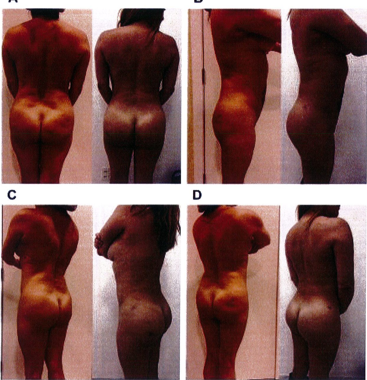 Hình. 8. (A-D) Ca 1: hình ảnh trước phẫu thuật nhìn từ phía sau, chếch sau trái, và bên trái bệnh nhân nữ 57 tuổi với tình trạng thiểu sản mông (Hình 2A, C). Hậu phẫu (5 ngày) nhìn từ phía sau, chếch sau trái, bên trái và chếch sau phải sau khi implant silicone hai bên mông (thể tích 325 mL) và ghép mỡ (B, D).
