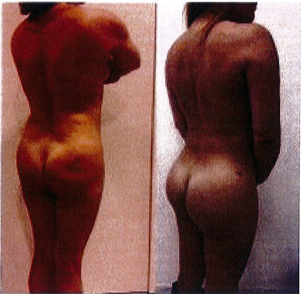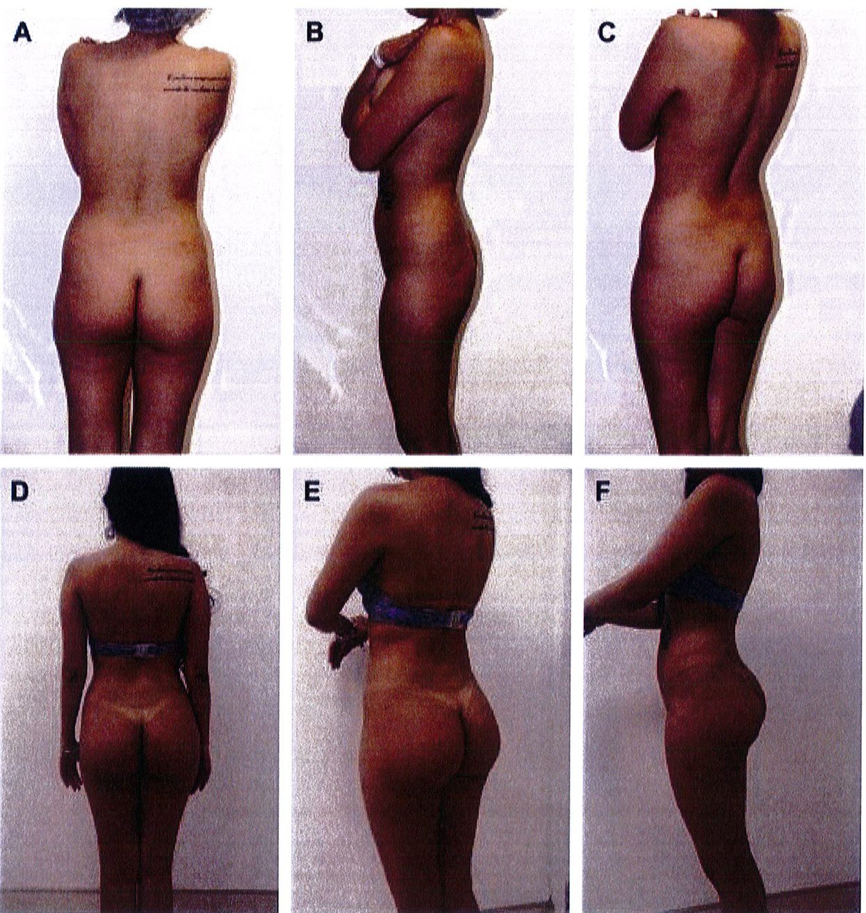 Hình. 9. (A-F) Ca 2: hình ảnh trước phầu thuật nhìn từ phía sau, chếch sau phải, và bên phải bệnh nhân nữ 23 tuổi với tình trạng thiểu sản mông (Hình. 3A, C, và E). Hậu phẫu (1 năm) nhìn từ phía sau, chếch sau phải và bên phải của bệnh nhân với khối implant thể tích 375 mL, và ghép mỡ tự thân (B, D, và F).