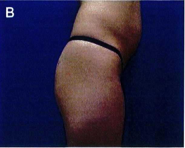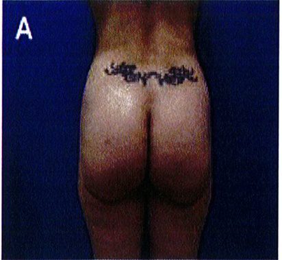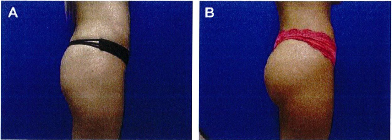 Hình. 2. Một phụ nữ 28 tuổi bị teo vùng mông mong muốn tăng kích thước và cải thiện dáng vẻ bề ngoài. (A) Sáu tháng sau khi thực hiện nâng mông trong cơ bằng khối implant tròn, dạng rắn với thể tích 189 cm3. (B) Chú ý cải thiện cả về kích thước lẫn hình thể bên ngoài.