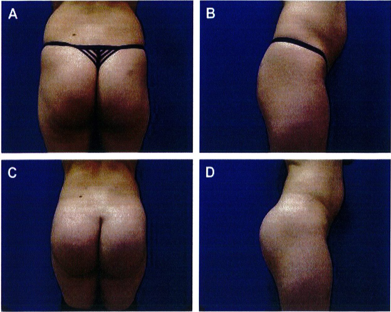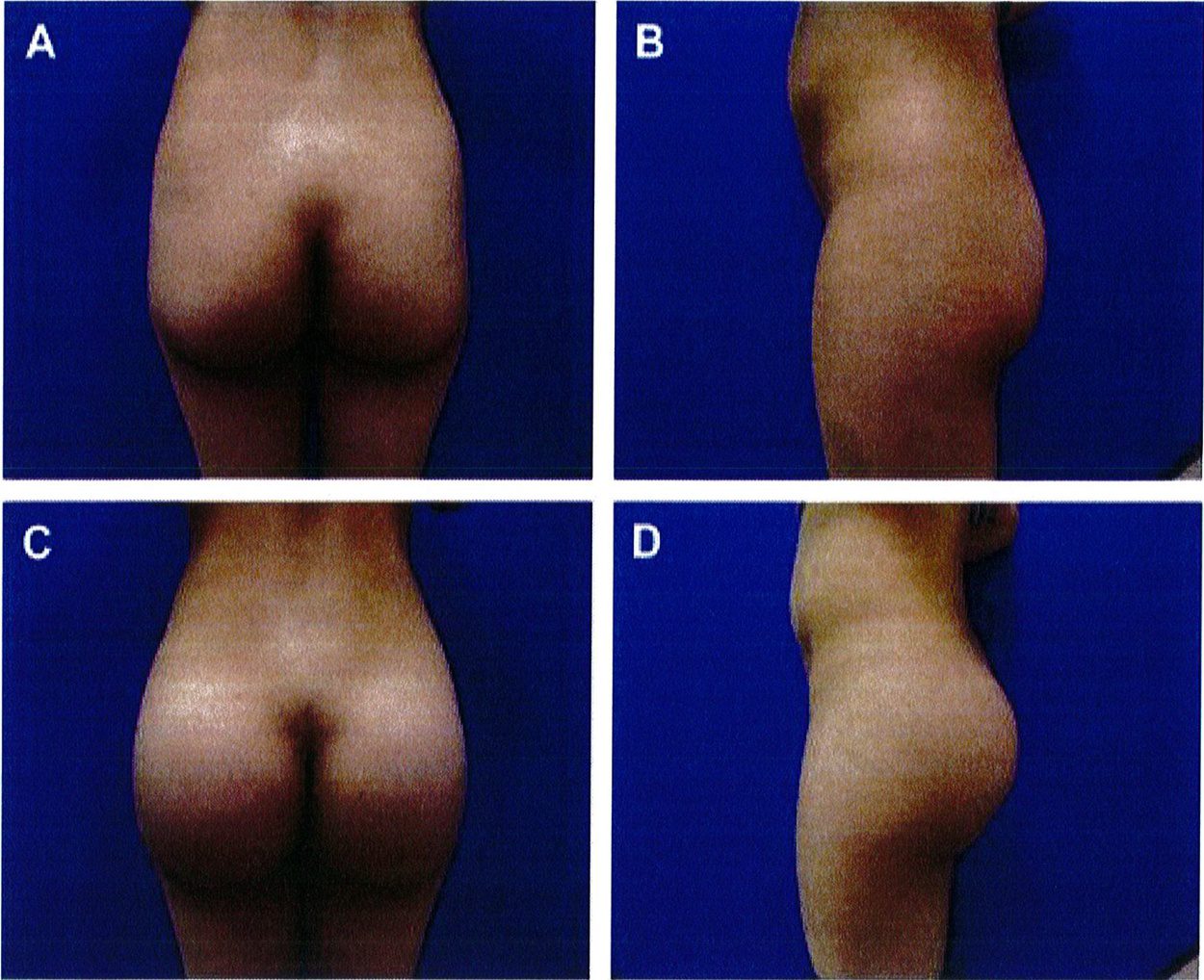 Hình. 1. Một phụ nữ 35 tuổi bị teo vùng mông mong muốn tăng kích thước và dáng vẻ bề ngoài. (A, B) Sáu tháng sau khi nâng mông với mô cấy là khối silicon tròn, dạng rắn với thể tích là 276 cm3. (C,D) Chú ý tăng thể tích nhưng đồng thời cũng phải đảm bảo vùng mông nhô ra tai đúng vi trí trung tâm.