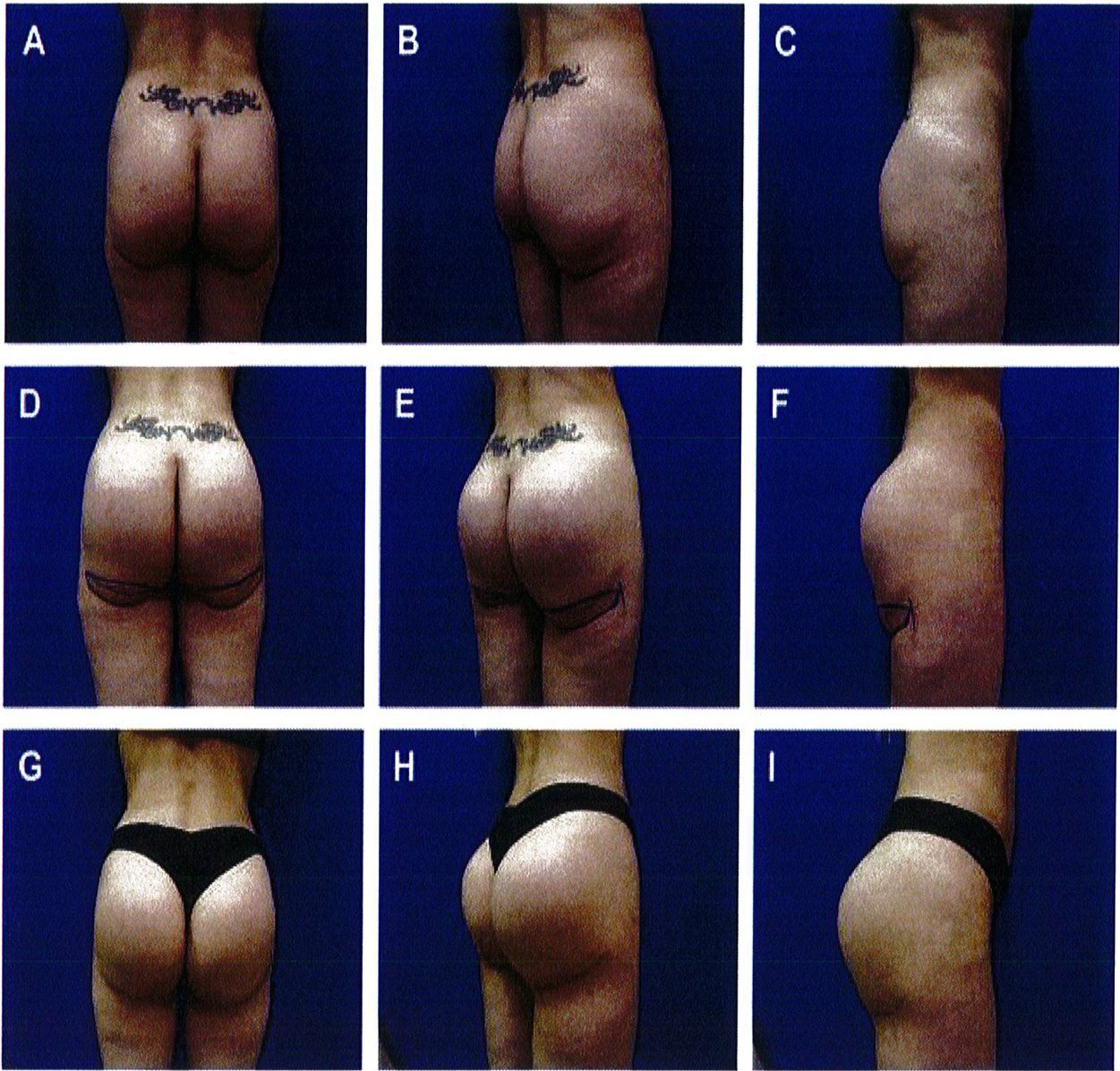 Hình. 4. Một phụ nữ 46 tuổi yêu cầu tăng kích thước vùng mông hai bên và loại bỏ lượng da thừa ở vùng này. (A-C) Một tháng sau khi thực hiện implant mông dưới cân với khối silicone dạng rắn, tròn, thể tích 276 cm3. Lưu ý các điểm đánh dấu trước phẫu thuật nhằm cải thiện nếp lằn mông. (D-F) 11 tháng sau khi implant và nếp lằn mông được chỉnh sửa (G-I)