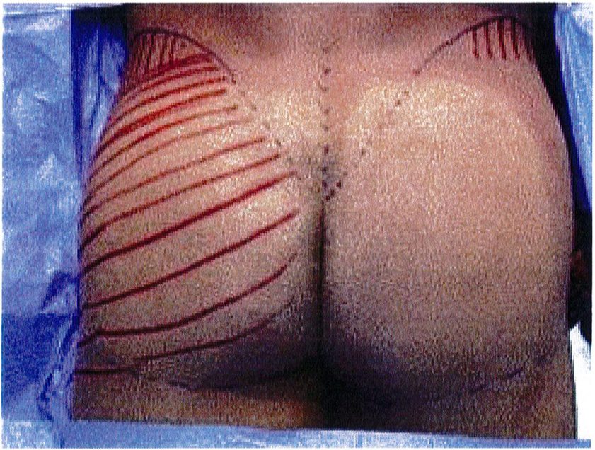 Hình. 5. Đánh dấu vùng phẫu thuật phải tuân theo hình thể giải phẫu vốn có của từng bệnh nhân và đảm bảo rằng khối implant sẽ nằm phía ngoài xương cùng và cách nếp lằn mông khoảng 2-5 cm. (Trích từ de la Pena JA, Rubio OV, Cano JP, et al. Subfascial Gluteal Augmentation. Clin Plast Surg 2006;33:410; đã xin phép trước khi đăng tải.)