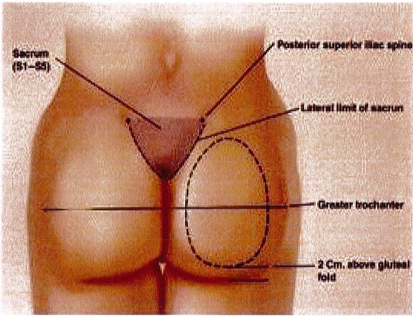 tiêu bản như hình 4. Tiêu bản này phải được đặt chính giữa vùng mông, cách nếp lằn mông ít nhất 5cm và đường liên gai ít nhất 2cm (Hình. 5).