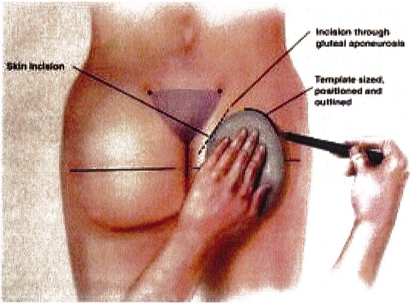 Hình. 7. Đặt sizer lên trên vùng mông để ước lượng vị trí khối implant. (Trích từ de la Pena JA. Subfascial technique for Gluteal Augmentation. Aesthet Surg J 2004;24:268; đã xin phép trước khi đăng tải.)