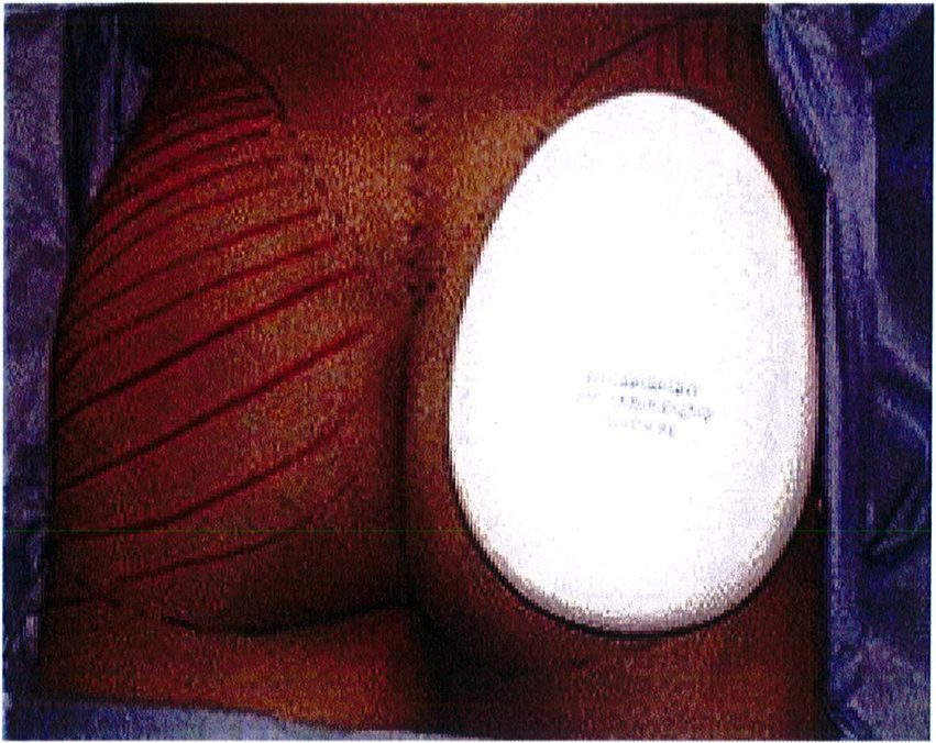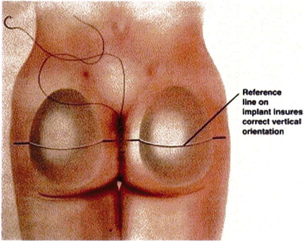 Sau đó, mô cấy sẽ được đưa vào, đảm bảo rằng nó được căn chỉnh hoàn hảo, thẳng trục và vừa khít bên trong túi (Hình 15). Chúng tôi nhấn mạnh rằng tất cả các khối implant đều phải có 1 đường trắng chạy ngang qua tâm điểm của chúng để tạo thuận cho việc căn chỉnh vị trí (Hình 16). Không bao giờ được đặt khối implant chếch vì chúng sẽ tạo ra hiệu ứng bong bóng kép ở ¼ dưới ngoài vùng mông (Hình 17).